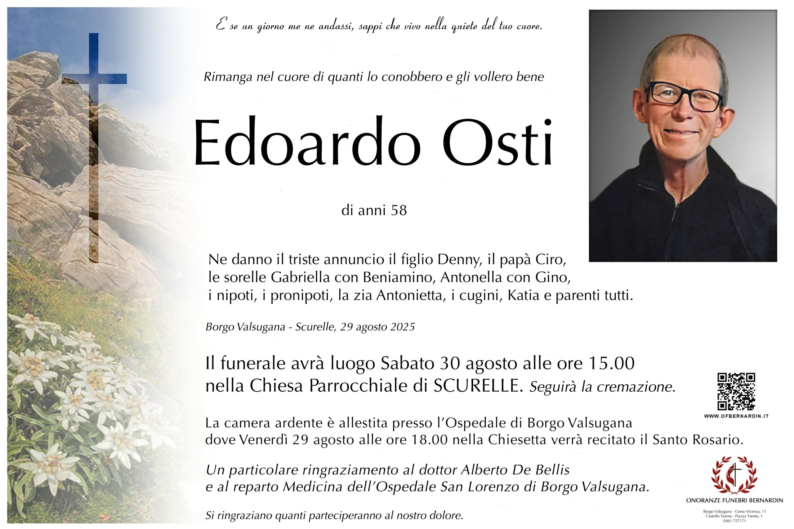 La camera ardente è allestita presso l’Ospedale di Borgo Valsugana dove Venerdì 29 agosto alle ore 18.00 nella Chiesetta verrà recitato il Santo Rosario.