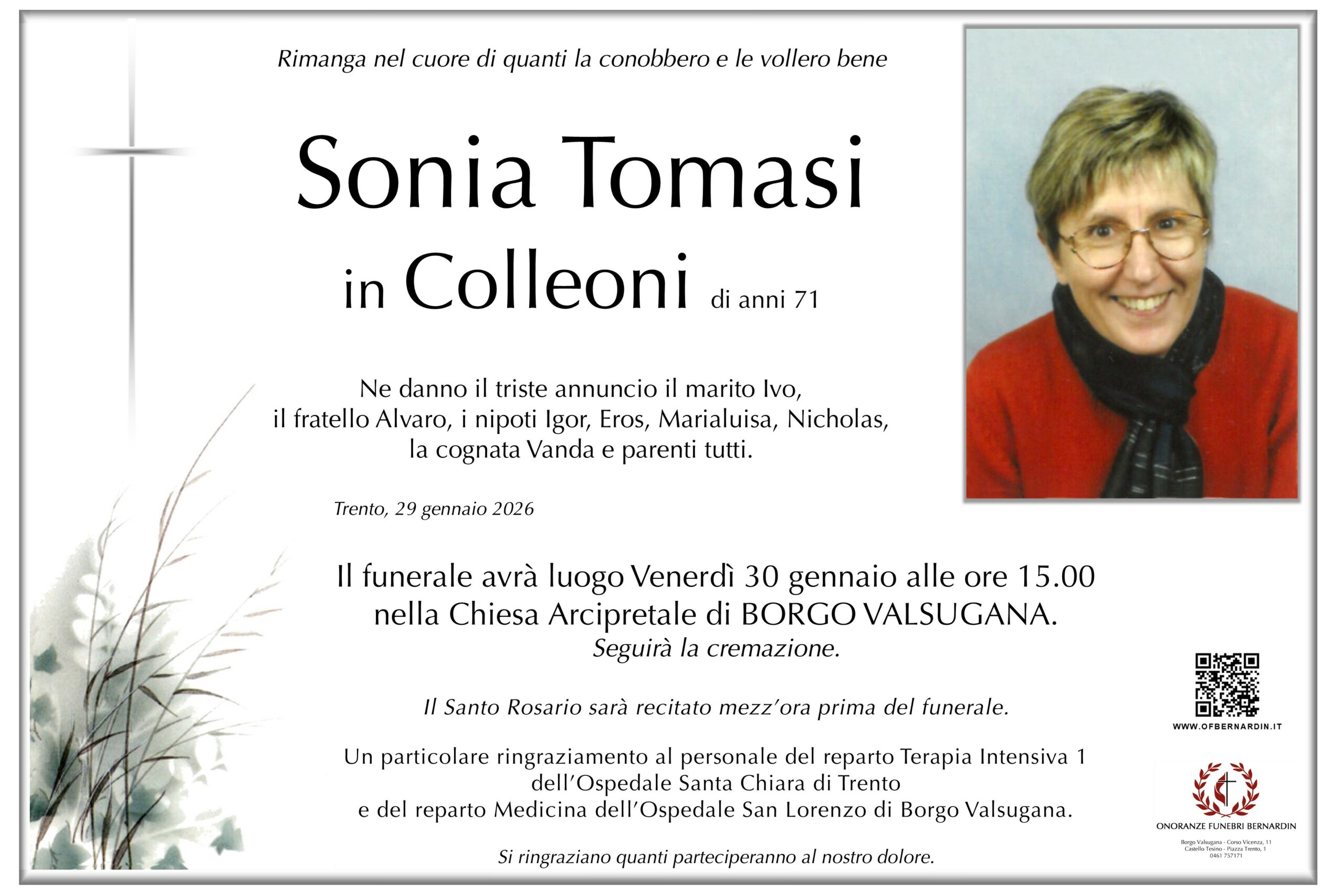 Il funerale avrà luogo Venerdì 30 gennaio alle ore 15.00 nella Chiesa Arcipretale di BORGO VALSUGANA.